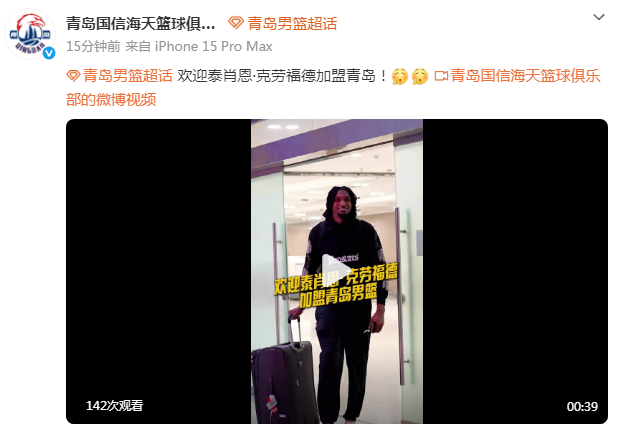 青岛男篮官方晒出泰肖恩-克劳福德加盟的海报,并且在公告写道:“经双方友好沟通,青岛国信海天篮球俱乐部与泰肖恩-克劳福德已完成签约。按照CBA公司注册管理规定,待相关材料齐备、CBA公司审核注册公示通过,泰肖恩-克劳福德将正式代表我俱乐部参加2025-2026赛季CBA联赛。